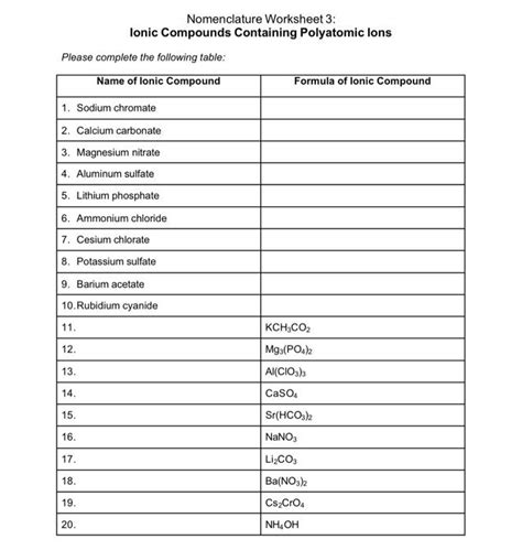 Nomenclature Worksheet 3 is an excellent resource for those who wish to learn about the nomenclature of ionic compounds containing polyatomic ions. The worksheet contains a number of questions that the student must answer in order to get a better understanding of the topic. The answers to these questions are provided in the worksheet itself, making it an invaluable resource for those who wish to learn about this important topic.